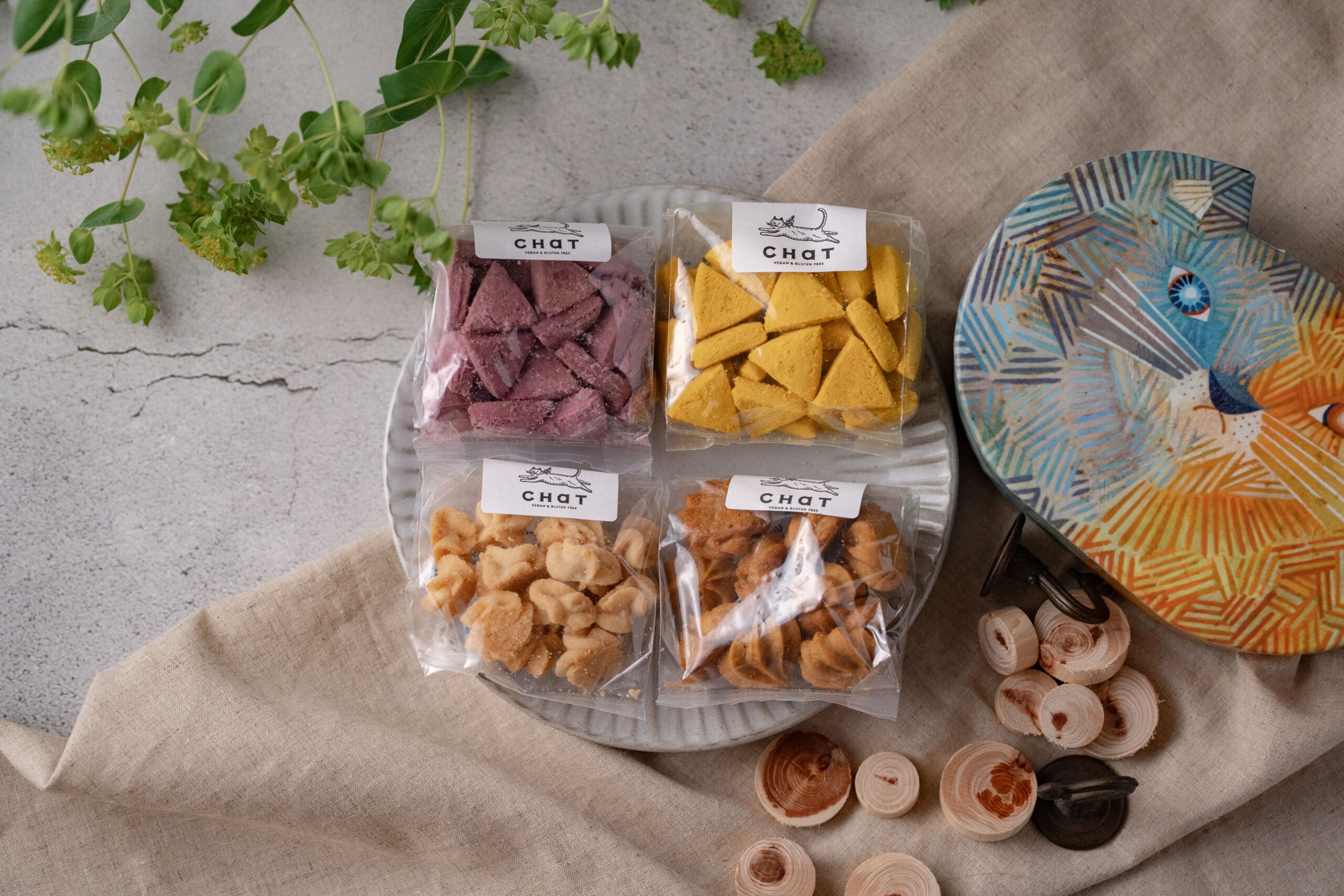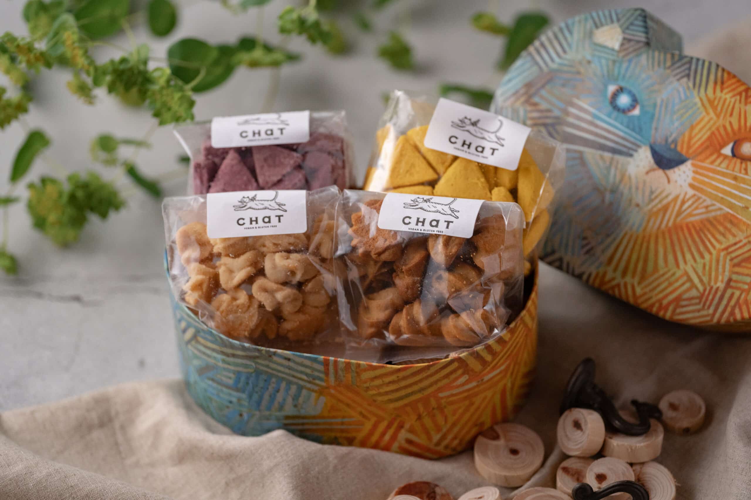 さらに、白砂糖や食塩も不使用、油脂の使用も最低限でノンカフェイン。本当に体のことを考えて作ったクッキーが全部で4種類(かぼちゃボーロ、紫芋ボーロ、おいもクッキー、メープルシュガークッキー)入っています。愛らしい猫の顔がデザインされたボックスに入っています。ギフトにもおすすめです。